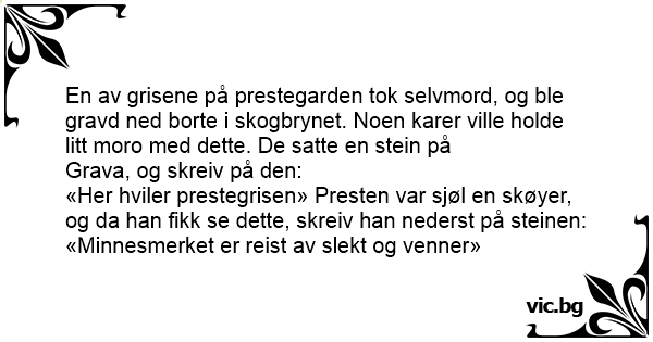 En av grisene på prestegarden tok selvmord, og ble gravd ned borte i skogbrynet. Noen karer ville holde litt moro med dette. De satte en stein på