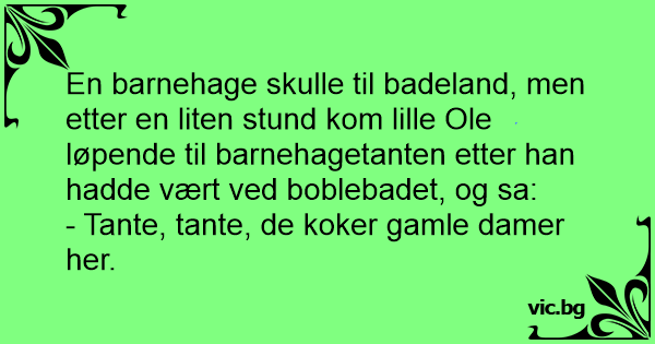 En barnehage skulle til badeland, men etter en liten stund kom lille Ole løpende til barnehagetanten etter han hadde vært ved boblebadet, og sa: