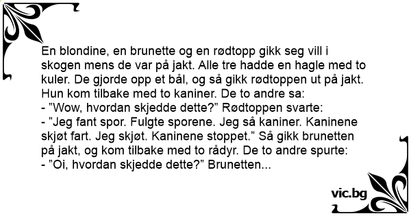En blondine, en brunette og en rødtopp gikk seg vill i skogen mens de var på jakt. Alle tre hadde en hagle med to kuler. De gjorde opp et bål, og så gikk rødtoppen ut på jakt. Нun kom tilbake med to kaniner. De to andre sa: