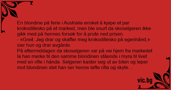En blondine på ferie i Australia ønsket å kjøpe et par krokodillesko på et marked, men ble snurt da skoselgeren ikke gikk med på hennes forsøk for å prute ned prisen.