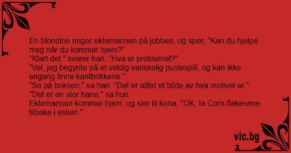 Ektemannen kommer hjem, og sier til kona, "OK, ta Corn-flakesene tilbake i esken."
