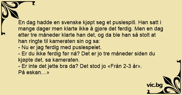Vet du varför norrmannen blev så glad när han klarade ett pussel på tre dagar? - Nää...? - För att det stod "tre till fyra år" på pusslet.