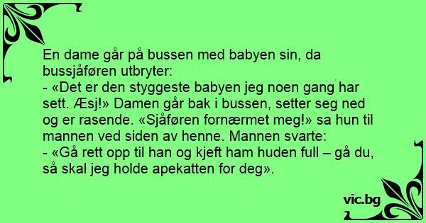 - «Det er den styggeste babyen jeg noen gang har sett. Æsj!» Damen går bak i bussen, setter seg ned og er rasende. «Sjåføren fornærmet meg!» sa hun til mannen ved siden av henne. Mannen svarte: