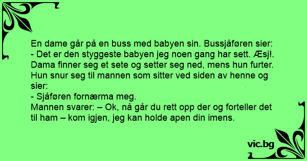 Το πιο άσχημο μωρό The baby Το άσχημο μωρό Една жена се качила в автобус с бебето си. Шофьорът казал: В автобусе едет женщина с ребёнком.Заходит пьяный мужик: A woman gets on a bus with her baby. The bus driver says, "That's the ugliest baby that I've ever seen. Ugh!" Uma mulher entra no ônibus com seu filho e o motorista se espanta:,- Nossa, é o bebê mais feio que já vi!,A mulher ouve calada e senta na parte de trás do ônibus. Bufando, desabafa para outro passageiro:,- O motorista me insultou!,E o passageiro recomenda:,- Vá lá... I was walking home last night when I noticed an old drunk staggering along the road. He passed a woman who was walking a young child. "Lady", said the drunk, "that's the ugliest kid I've ever seen. Damn, that is one ugly child!." As the drunk wandered off, the lady burst into tears. Just then,... Wchodzi kobieta z czarnym dzieckiem na rękach do autobusu. - Fuj, jakie brzydkie dziecko - mówi kierowca autobusu. Kobieta oburzona, ba, wpieniona na maksa siada obok innego pasażera i mówi: - Słyszał pan? Jak tak można. Jaki niekulturalny, jaka... Kommt eine Frau mit ihrem Kind auf dem Arm in den Bus. Sagt der Busfahrer: "Mensch sie haben aber ein häßliches Kind!" Schockiert und immer noch verärgert setzt sich die Frau in den Bus. Ihr... På en buss i London satt en ung kvinna med sin baby i famnen när en berusad man klev på och stannade framför henne. Mannen tittade en lång stund på barnet och sa sedan så högt att alla i bussen... Met haar baby van zes dagen op de arm stapt Annie de bus in. "Dat is de lelijkste baby die ik ooit heb gezien!" zei de chauffeur, waarop Annie woedend achter in de bus plaatsneemt. De man naast... Annie stapt de bus in met haar pasgeboren baby op haar arm. Zegt de buschauffeur: 'Tering! Zo'n lelijk kind heb ik nog nooit gezien!' Annie wordt boos en gaat helemaal achterin de bus zitten. Een... O femeie cu un copil in brate se urca in autobuz. Soferul Zice: - Aoleu, asta e cel mai urit copil pe care l-am vazut Vreodata. Femeia Se duce in spatele autobuzului si se asaza pe scaun, Spumegind... Een vrouw staat samen met haar baby op de arm te wachten bij een bushalte. Als de bus aan komt en de vrouw instapt zegt de buschauffeur: "Dat is de lelijkste baby die ik ooit heb gezien!" De vrouw... En dame går på bussen med babyen sin, da bussjåføren utbryter: - «Det er den styggeste babyen jeg noen gang har sett. Æsj!» Damen går bak i bussen, setter seg ned og er rasende. «Sjåføren fornærmet... A woman got on a bus holding a baby. The bus driver looked at the child and blurted out, "That's the ugliest baby I've ever seen!" Infuriated, the woman slammed her fare into the fare box and took... Kadın bebeğiyle otobüse binerken otobüs şöförü kendini tutamayıp şöyle demiş: - Aman tanrım ne kadar çirkin bir bebek... Kadın sinirle biletini kutuya basmış, en arka tarafa geçmiş, bir adamın... A lady boards the bus with her baby. The bus driver looks at the baby and says "that's the ugliest thing I've ever seen!" The lady finds a seat and she is mad as hell. She tells the guy in the seat... A woman walks onto the Bus with his child. The driver says, "That’s the ugliest child I have seen!" The woman sits down and tells her neighbor. The neighbor replies, “Go say something back. Here,... Uma Senhora estava sentada com o seu filhinho no colo, na poltrona do ônibus, quando chegou um cavalheiro e sentou ao lado dela, quando ele olhou para a criança, ficou espantado e falou: "Virgem... En kvinde kommer ind i en bus med en baby på armen... Chaufføren kigger længe på ungen og udbryder: "Hold da kæft en grim unge" Kvinden sætter sig bagest i bussen, mens hun er ved at koge over af... Moteris su mažu vaiku įlipa į mikroautobusą. Vairuotojas imdamas pinigus, dėbteli į vaiką: - Nieko sau! Tokios baidyklės dar nematęs! Keleivė skubiai pereina į mikroautobuso galą ir susinervinus...