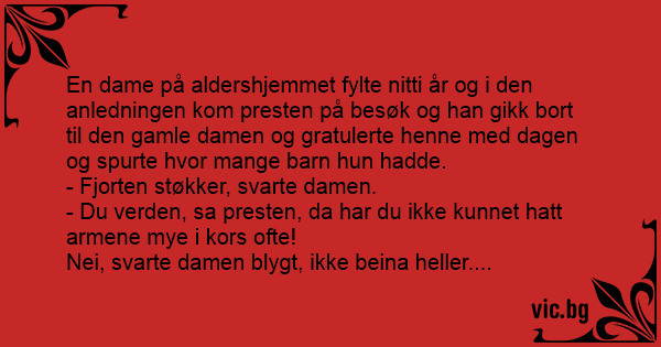 En dame på aldershjemmet fylte nitti år og i den anledningen kom presten på besøk og han gikk bort til den gamle damen og gratulerte henne med dagen og spurte hvor mange barn hun hadde.