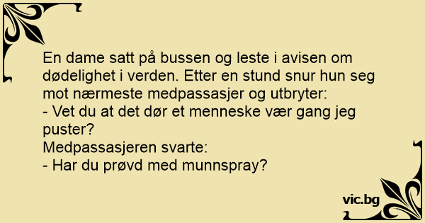 En dame satt på bussen og leste i avisen om dødelighet i verden. Etter en stund snur hun seg mot nærmeste medpassasjer og utbryter: