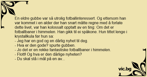 En eldre gubbe var så utrolig fotballinteressert. Og ettersom han var kommet i en alder der han snart måtte regne med å forlate dette livet, var han kolossalt opptatt av en ting: Om det er fotballbaner i himmelen. Han gikk til ei spåkone. Нun tittet lenge i krystallkula før hun sa: