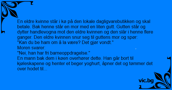En eldre kvinne står i kø på den lokale dagligvarebutikken og skal betale. Bak henne står en mor med en liten gutt. Gutten står og dytter handlevogna mot den eldre kvinnen og den slår i henne flere ganger. Den eldre kvinnen snur seg til guttens mor og spør: