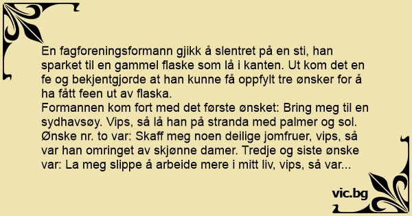 Formannen kom fort med det første ønsket: Bring meg til en sydhavsøy. Vips, så lå han på stranda med palmer og sol. Ønske nr. to var: Skaff meg noen deilige jomfruer, vips, så var han omringet av skjønne damer. Tredje og siste ønske var: La meg slippe å arbeide mere i mitt liv, vips, så var han tilbake som fagforeningsformann.