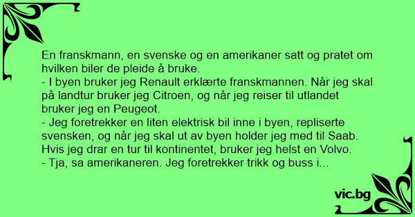 En franskmann, en svenske og en amerikaner satt og pratet om hvilken biler de pleide å bruke.