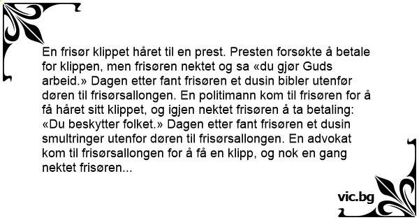En frisør klippet håret til en prest. Presten forsøkte å betale for klippen, men frisøren nektet og sa «du gjør Guds arbeid.» Dagen etter fant frisøren et dusin bibler utenfør døren til frisørsallongen. En politimann kom til frisøren for å få håret sitt klippet, og igjen nektet frisøren å ta betaling: