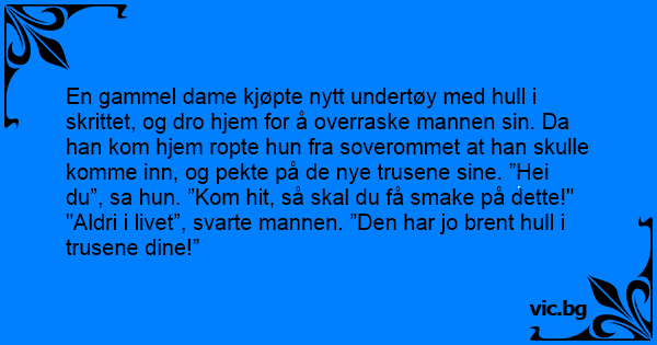 En gammel dame kjøpte nytt undertøy med hull i skrittet, og dro hjem for å overraske mannen sin. Da han kom hjem ropte hun fra soverommet at han skulle komme inn, og pekte på de nye trusene sine. ”Hei du”, sa hun. ”Kom hit, så skal du få smake på dette!"