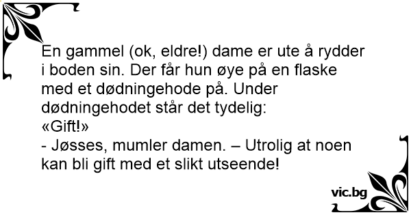 En gammel (ok, eldre!) dame er ute å rydder i boden sin. Der får hun øye på en flaske med et dødningehode på. Under dødningehodet står det tydelig: