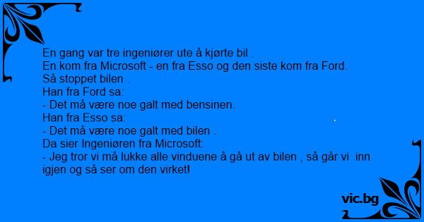 Програмист, електроинженер и механик пътуват с кола. Колата се поврежда. Механика казва: - Сигурно е ремъка. Ей сега ще погледна. Никаква полза. Електроинженера се намесва: - Чакай да видя...