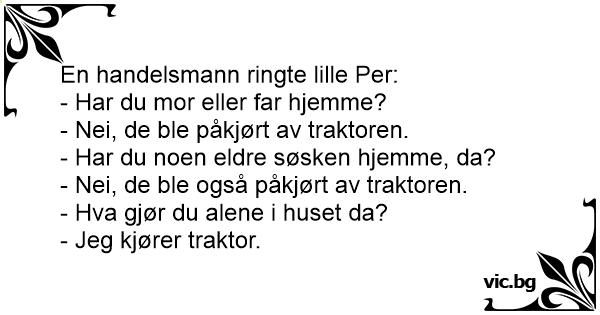 Ruft die Frau Maier an und fragt: "Ist deine Mutter da?" Fritzi am Telefon. "Nein vom Traktor überfahren." "Ist der Papa da?" "Nein vom Traktor überfahren!" "Ist sonst jemand zu Hause?" "Nein die sind alle vom Traktor überfahren!" "Und was machst du???" "Traktor fahrn!!!"
