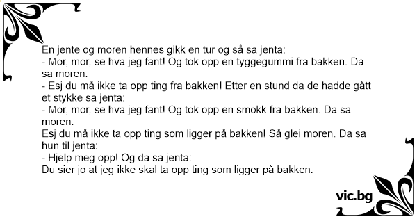 - Mor, mor, se hva jeg fant! Og tok opp en tyggegummi fra bakken. Da sa moren: