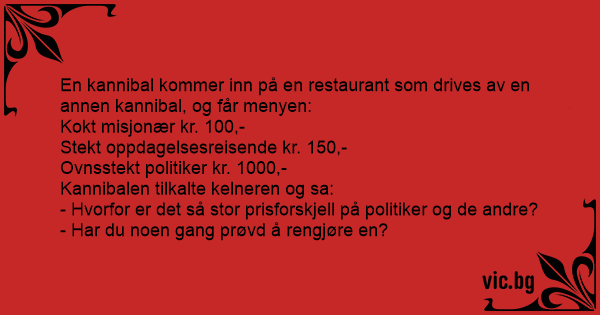 En kannibal vandrade genom djungeln när han plötsligt fick syn på en restaurang, ägd av en annan kannibal. Hungrig som han var gick han in och satte sig vid ett bord och granskade menyn: *...