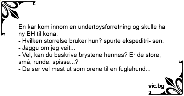 Мъж избира сутиен за жена си. Продавачката: - Какви са й гърдите, като праскови, портокали или дини? - По скоро като уши на дакел