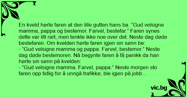 - ”Gud velsigne mamma og pappa. Farvel, bestemor.” Neste dag døde bestemoren. Nå begynte faren å få panikk da han hørte sin sønn på kvelden: