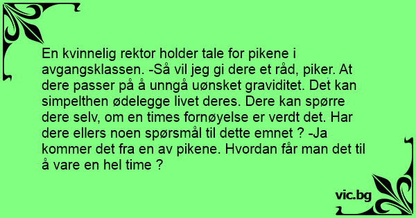 En kvinnelig rektor holder tale for pikene i avgangsklassen. -Så vil jeg gi dere et råd, piker. At dere passer på å unngå uønsket graviditet. Det kan simpelthen ødelegge livet deres. Dere kan spørre dere selv, om en times fornøyelse er verdt det. Har dere ellers noen spørsmål til dette emnet ? -Ja kommer det fra en av pikene. Hvordan får man det til å vare en hеl time ?