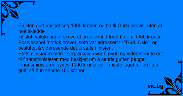 - Kjære Gud, tusen takk for pengene du sendte meg. Jeg har forresten merket meg at du sendte det via regjeringen, og de drittsekkene trakk 90 prosent i skatt!
