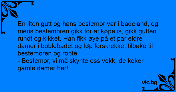 En liten gutt og hans bestemor var i badeland, og mens bestemoren gikk for at køpe is, gikk gutten rundt og kikket. Han fikk øye på et par eldre damer i boblebadet og løp forskrekket tilbake til bestemoren og ropte: