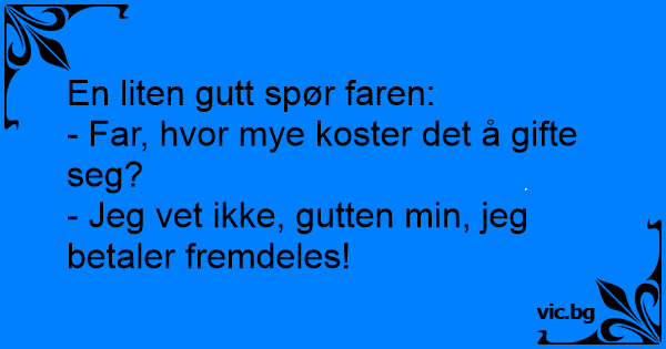 Knægten til faderen: - Far, hvad koster det egentlig at blive gift? Faderen: - Det ved jeg ikke sønnike - jeg betaler stadig væk for det...