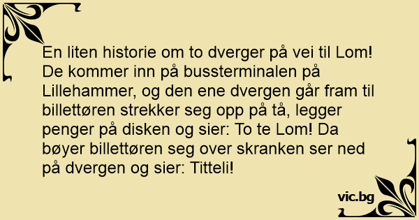 En liten historie om to dverger på vei til Lom! De kommer inn på bussterminalen på Lillehammer, og den ene dvergen går fram til billettøren strekker seg opp på tå, legger penger på disken og sier: To te Lom! Da bøyer billettøren seg over skranken ser ned på dvergen og sier: Titteli!