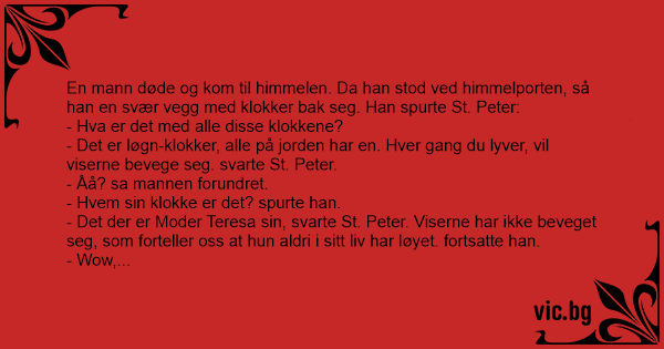 - Det der er Moder Teresa sin, svarte St. Peter. Viserne har ikke beveget seg, som forteller oss at hun aldri i sitt liv har løyet. fortsatte han.