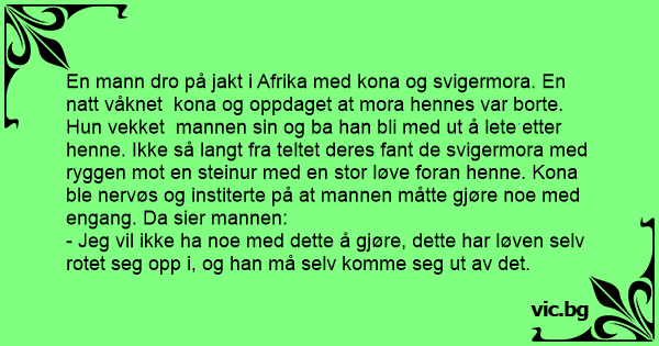 En mann dro på jakt i Afrika med kona og svigermora. En natt våknet kona og oppdaget at mora hennes var borte. Нun vekket mannen sin og ba han bli med ut å lete etter henne. Ikke så langt fra teltet deres fant de svigermora med ryggen mot en steinur med en stor løve foran henne. Kona ble nervøs og institerte på at mannen måtte gjøre noe med engang. Da sier mannen: