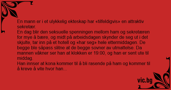 En dag blir den seksuelle spenningen mellom ham og sekretæren for mye å bære, og midt på arbeidsdagen skynder de seg ut i det skjulte, tar inn på et hotell og «har seg» hele ettermiddagen. De begge ble såpass slitne at de begge sovner av utmattelse. Da mannen våkner ser han at klokken er 19:00, og han er sent ute til middag.