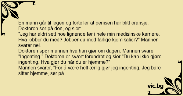 Doktor - "Doktor doktor! Hjælp mig min pik er blevet helt orange!" - "Jamen dog, hvad har du dog lavet i weekenden?" - "Ikke en skid! Set pornofilm og spist ostepops!"