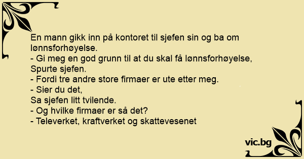 Служител към началника си: - Oiga jefe auménteme el sueldo. Tenga en cuenta que hay cuatro empresas detrás de mí. - Desculpe-me, chefe, posso falar com o senhor? A worker goes to his boss and says, ‘You have to give me a raise. There are three other companies after me.’ ‘Is that so?’ says the manager. ‘And what companies are those?’ The worker replies, ‘The electric company, the telephone company, and the gas company.’ Jefe, auménteme el sueldo que hay 4 empresas detrás de mi - ¿Cuales son? - La del cable, el gas, la luz y el teléfono Un empleado le dice a su jefe: - Jefe, súbame el sueldo. Le advierto que hay cuatro empresas detrás de mí! -¿Ah sí? ¿Y cuáles son? - La del gas, la luz, cable y el teléfono! Un giornalista entra nell'ufficio del direttore: "Mi scusi direttore, ma devo chiederle un aumento. Sa, ci sono tre importanti aziende che continuano a scrivermi." "Davvero? E quali sarebbero?"... O sujeito vai pedir aumento pro chefe: — Acho melhor o senhor me promover! Tem muitas empresas me procurando... — É mesmo? — pergunta o chefe, irônico — Quais são essas empresas? — A empresa de... Un empleado entra al despacho de su jefe para pedirle que le suba el sueldo y le dice: - Señor, debe subirme el sueldo, porque le advierto que hay tres compañías que andan detrás de mí. El jefe le... En ansatt i et stort selskap i Oslo tok endelig mot til seg, og trappet opp på sjefens kontor: – Jeg krever høyere lønn, sa han bestemt. – Javel, og hva er begrunnelsen for det, spurte den unge... Un impiegato di un ufficio al suo direttore: “Mi scusi, signor direttore, ma sono costretto a chiederle un aumento di stipendio. Ci sono ben tre imprese interessate a me”. “E quali sarebbero?”.... Pracownik do dyrektora: - Jestem zmuszony prosić pana o podwyżkę, ponieważ intersują się mną trzy firmy. - A moge wiedzieć jakie? - pyta dyrektor. - Elektrownia, gazownia i wodociągi. - Boss,es vēlētos lielāku algu,jo par mani jau izrāda interesi trīs citi nopietni uzņēmumi. - Un kas tie par uzņēmumiem? - Namu pārvalde,LMT un Latvenergo. Tarnautojas sako viršininkui: - Norėčiau, kad padidintumėt man atlyginimą. Manimi jau domisi 3 didelės organizacijos. - Kokios? - Telekomas, seniūnija, elektros tinklai...