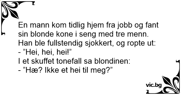 En mann kom tidlig hjem fra jobb og fant sin blonde kone i seng med tre menn. Han ble fullstendig sjokkert, og ropte ut: