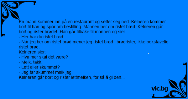 En mann kommer inn på en restaurant og setter seg ned. Kelneren kommer bort til han og spør om bestilling. Mannen ber om ristet brød. Kelneren går bort og rister brødet. Han går tilbake til mannen og sier.