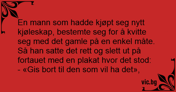 En mann som hadde kjøpt seg nytt kjøleskap, bestemte seg for å kvitte seg med det gamle på en enkel måte. Så han satte det rett og slett ut på fortauet med en plakat hvor det stod: