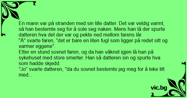 En mann var på stranden med sin lille datter. Det var veldig varmt, så han bestemte seg for å sole seg naken. Mens han lå der spurte datteren hva det der var og pekte ned mellom farens lår.