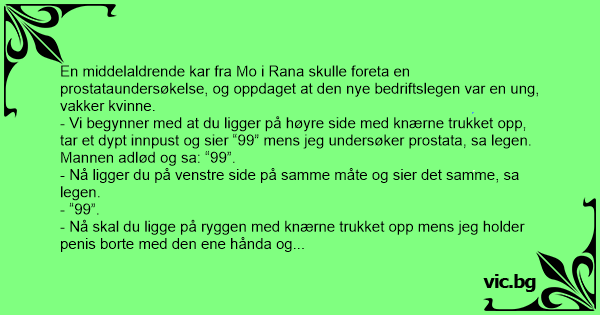 - Nå skal du ligge på ryggen med knærne trukket opp mens jeg holder реnis borte med den ene hånda og undersøker prostata med den andre, mens du sier “99”, fortsatte legen.
