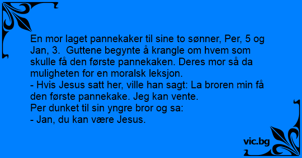 En mor laget pannekaker til sine to sønner, Per, 5 og Jan, 3. Guttene begynte å krangle om hvem som skulle få den første pannekaken. Deres mor så da muligheten for en moralsk leksjon.