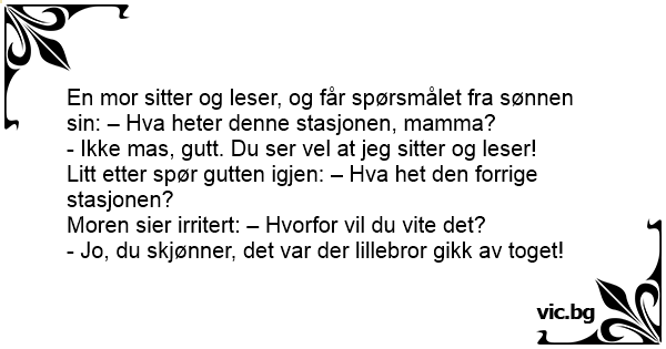 En mor sitter og leser, og får spørsmålet fra sønnen sin: – Hva heter denne stasjonen, mamma?