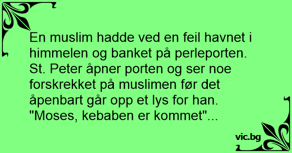 St. Peter åpner porten og ser noe forskrekket på muslimen før det åpenbart går opp et lys for han. "Моsеs, kebaben er kommet"...
