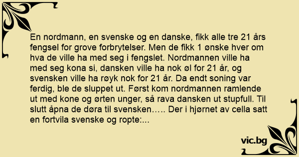 En nordmann, en svenske og en danske, fikk alle tre 21 års fengsel for grove forbrytelser. Men de fikk 1 ønske hver om hva de ville ha med seg i fengslet. Nordmannen ville ha med seg kona si, dansken ville ha nok øl for 21 år, og svensken ville ha røyk nok for 21 år. Da endt soning var ferdig, ble de sluppet ut. Først kom nordmannen ramlende ut med kone og ørten unger, så rava dansken ut stupfull. Til slutt åpna de døra til svensken….. Der i hjørnet av cella satt en fortvila svenske og ropte: