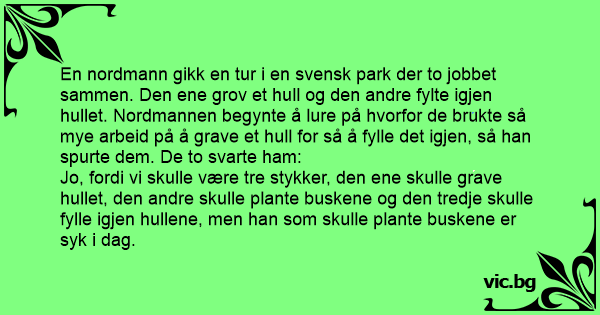 En nordmann gikk en tur i en svensk park der to jobbet sammen. Den ene grov et hull og den andre fylte igjen hullet. Nordmannen begynte å lure på hvorfor de brukte så mye arbeid på å grave et hull for så å fylle det igjen, så han spurte dem. De to svarte ham: