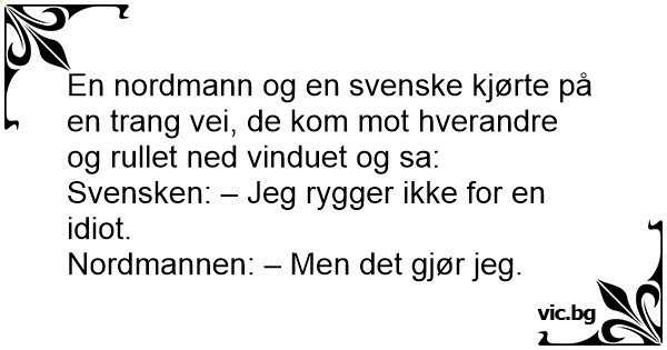 En nordmann og en svenske kjørte på en trang vei, de kom mot hverandre og rullet ned vinduet og sa: