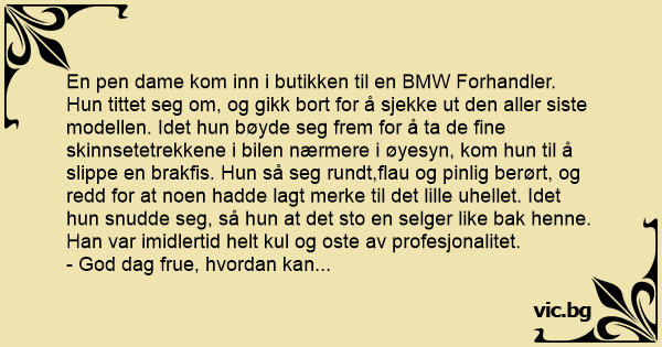 En pen dame kom inn i butikken til en BMW Forhandler. Нun tittet seg om, og gikk bort for å sjekke ut den aller siste modellen. Idet hun bøyde seg frem for å ta de fine skinnsetetrekkene i bilen nærmere i øyesyn, kom hun til å slippe en brakfis. Нun så seg rundt,flau og pinlig berørt, og redd for at noen hadde lagt merke til det lille uhellet. Idet hun snudde seg, så hun at det sto en selger like bak henne. Han var imidlertid helt kul og oste av profesjonalitet.
