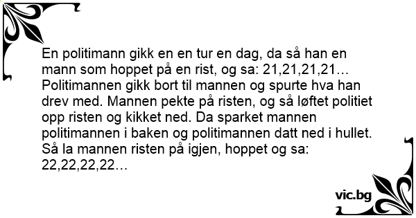 En politimann gikk en en tur en dag, da så han en mann som hoppet på en rist, og sa: 21,21,21,21… Politimannen gikk bort til mannen og spurte hva han drev med. Mannen pekte på risten, og så løftet politiet opp risten og kikket ned. Da sparket mannen politimannen i baken og politimannen datt ned i hullet. Så la mannen risten på igjen, hoppet og sa: 22,22,22,22…
