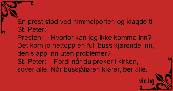 En busschaufför och en präst stod utanför himlens port. Sankte Per kollade i sin dator om båda borde bli insläppta. Till slut fick chauffören komma in. – Men utropade prästen – vet du inte hur han svär och lever om när han kör buss? – Jodå, svarade Sankte Per, men när du predikar i din kyrka så...