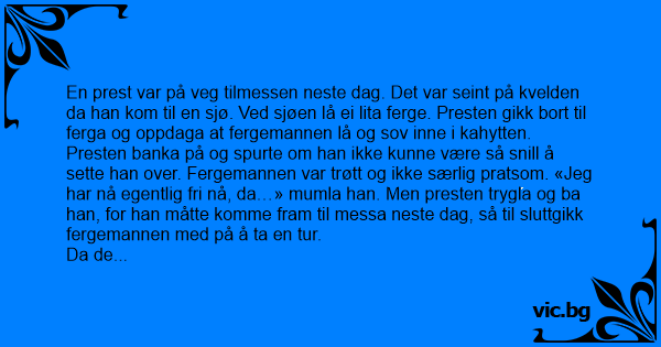 «Gud vil lønne deg i himmelen.» «Jo da, det er greit det», sa fergemannen, «men det er nå her på jorda jeg har gjeld, så tror du ikke at du kunne legge ut for han i mellomtiden?»