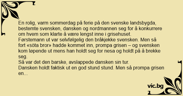 En rolig, varm sommerdag på ferie på den svenske landsbygda, bestemte svensken, dansken og nordmannen seg for å konkurrere om hvem som klarte å være lengst inne i grisehuset.