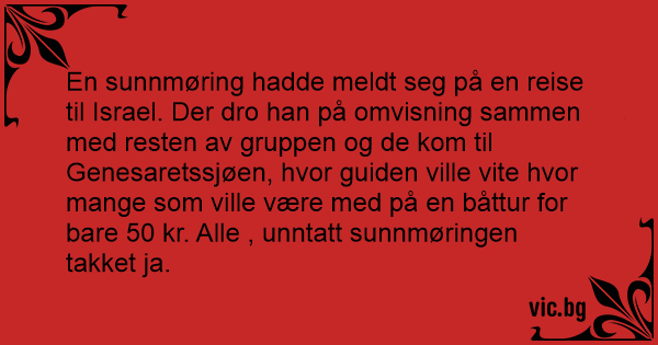En sunnmøring hadde meldt seg på en reise til Israel. Der dro han på omvisning sammen med resten av gruppen og de kom til Genesaretssjøen, hvor guiden ville vite hvor mange som ville være med på en båttur for bare 50 kr. Alle , unntatt sunnmøringen takket ja.
